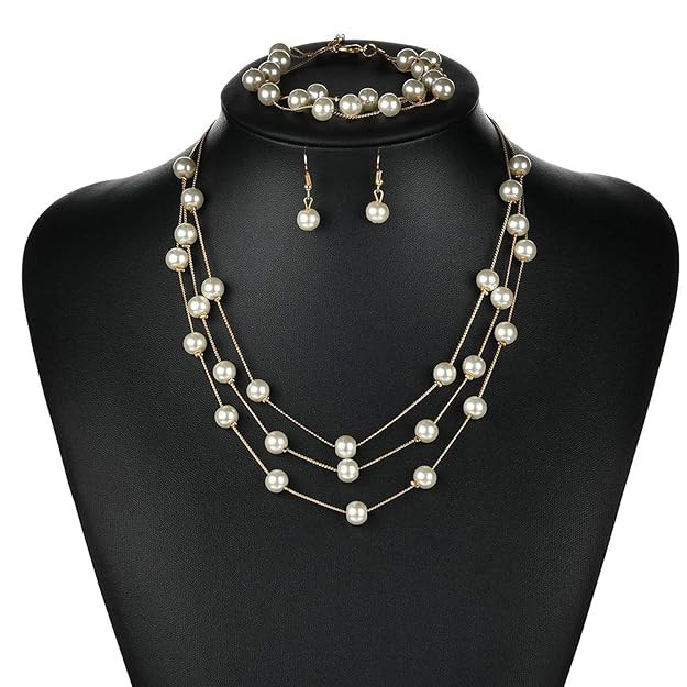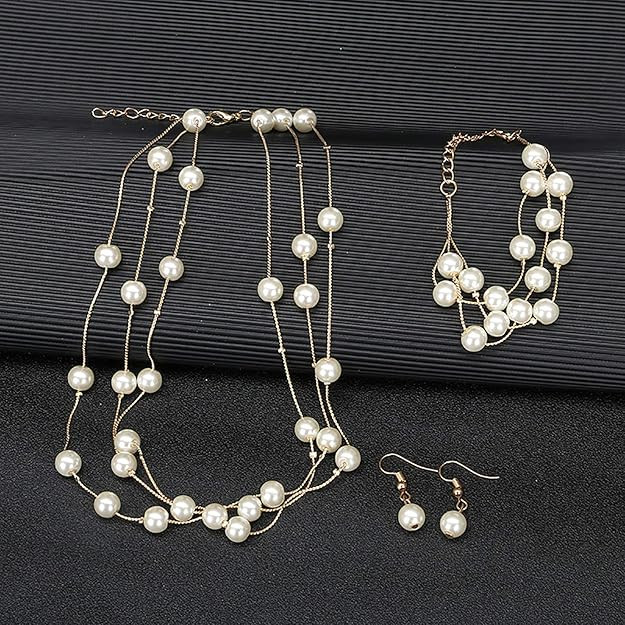 Beautiful jewelryset Dollops Of Sophistication For A Refined You! Designed In Gold Chains, This Multilayered Necklace Is Accented With Pristine White Pearls To Make You Look Flawlessly Beautiful! Chic And So Very Elegant, This Piece comes with a necklace, bracelet and earrings and Is Best Worn With Pastel Colors For Understated Subtlety.