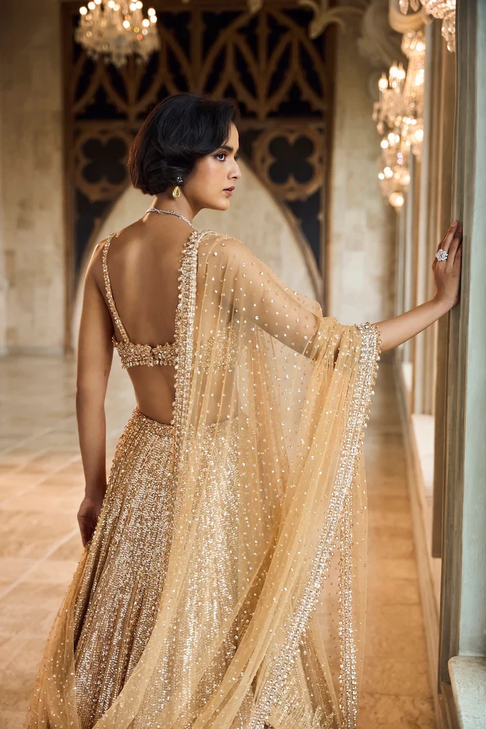 This lehenga set features intricate silver and gold crystal and sequin embroidery.The blouse shows crystal tassels at the waist. Embroidered dupatta also shows crystal tassels on all four sides.