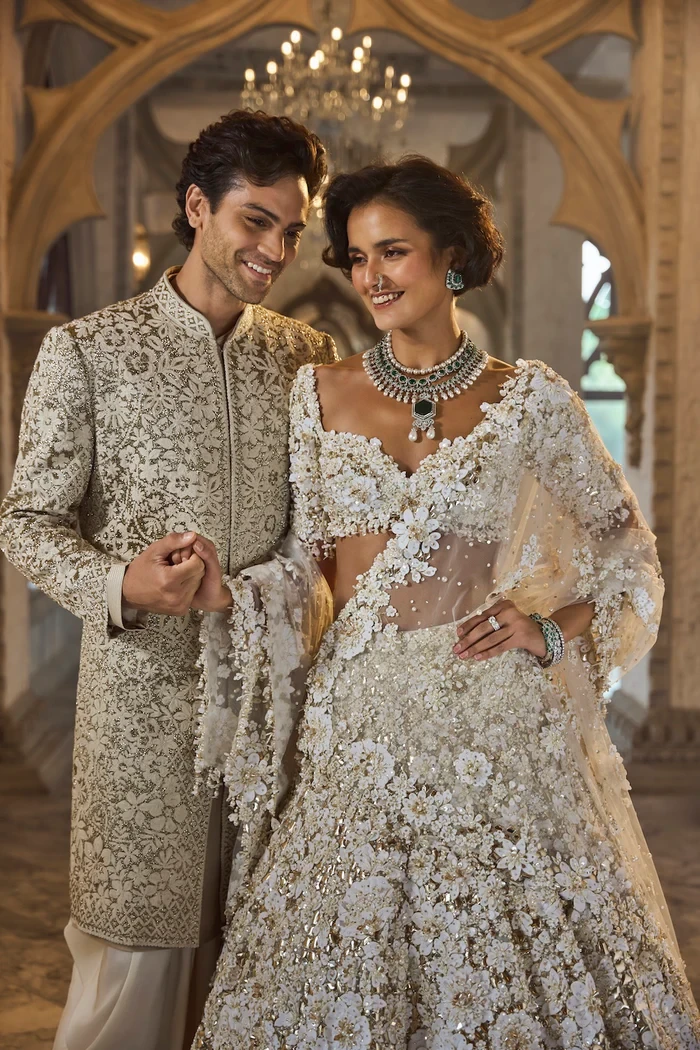 This lehenga set features all over three-dimensional embroidery in a floral pattern. The heavily embellished elbow sleeve blouse shows exaggerated floral tassels in pearl and sequin at the sleeve hem and at the waist. It is paired with a four sided embroidered net dupatta with tassels.