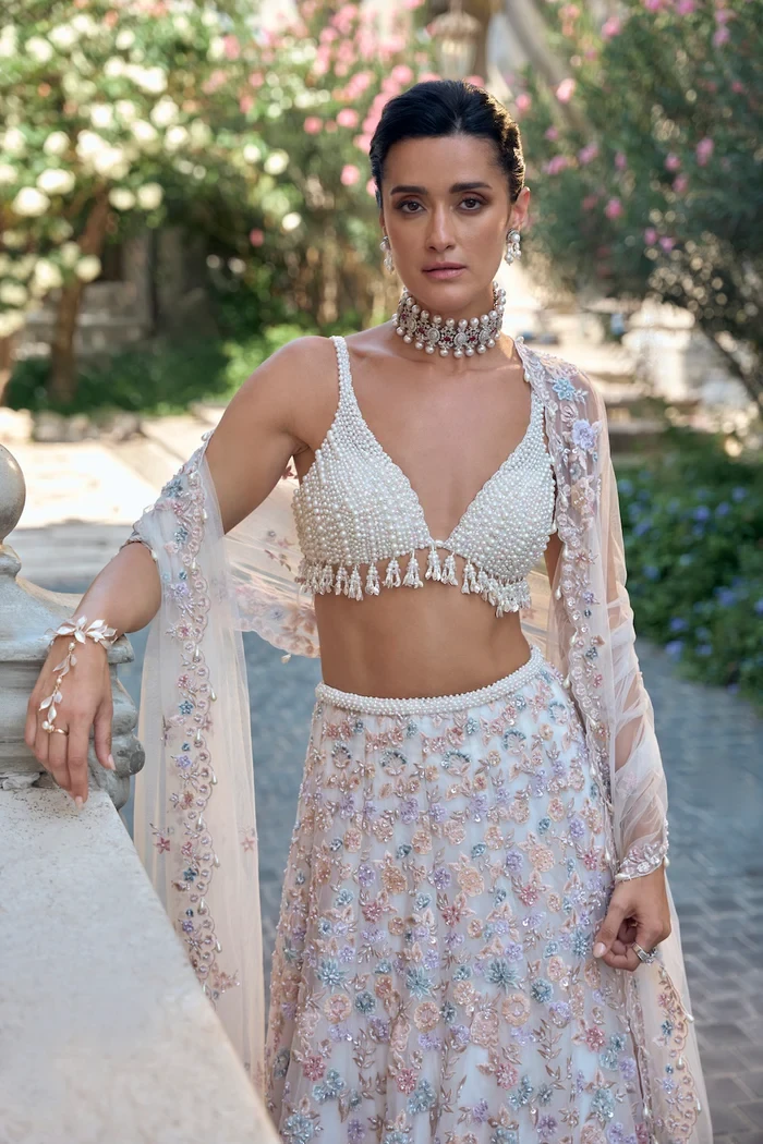 This lehenga set features all over thread embroidery in ivory, powder blue, peaches, mauves and sage green tones and highlighted with assorted pearls and crystals. It is paired with a fully embroidered blouse along with exaggerated tassels at the hem. The embroidered dupatta also shows pearl drops at all four sides.