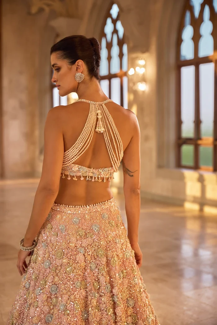 This lehenga set features three-dimensional floral embroidery in assorted colours. The sleeveless blouse is fully embroidered and shows delicate floral tassels at the waist. It is paired with the heavily embroidered dupatta having a matching border and floral motifs all over.