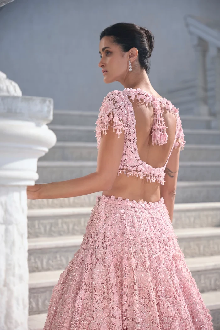 This lehenga set features heavy three-dimensional cut work embroidery in crystal, thread, pearl and sequin. The blouse shows cut work embroidery with delicate crystal tassels at the waist, sleeve and 3D flowers at the back. It is paired with the heavily embroidered dupatta shows double borders, floral motifs and floral tassels all over.