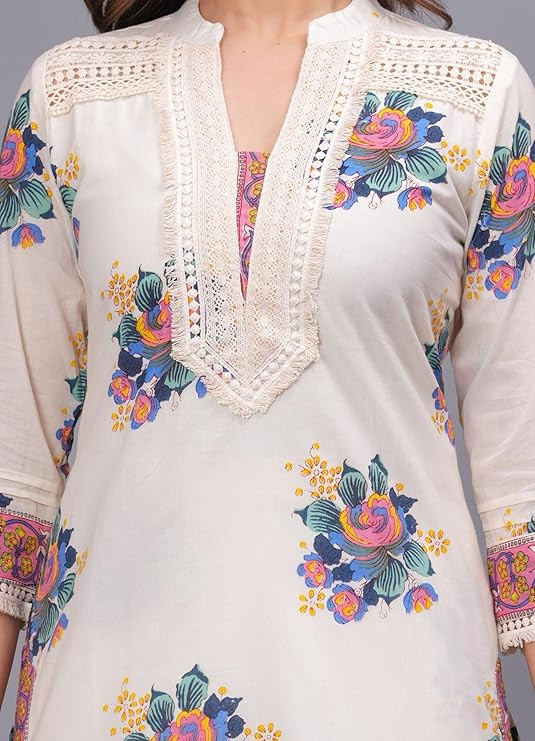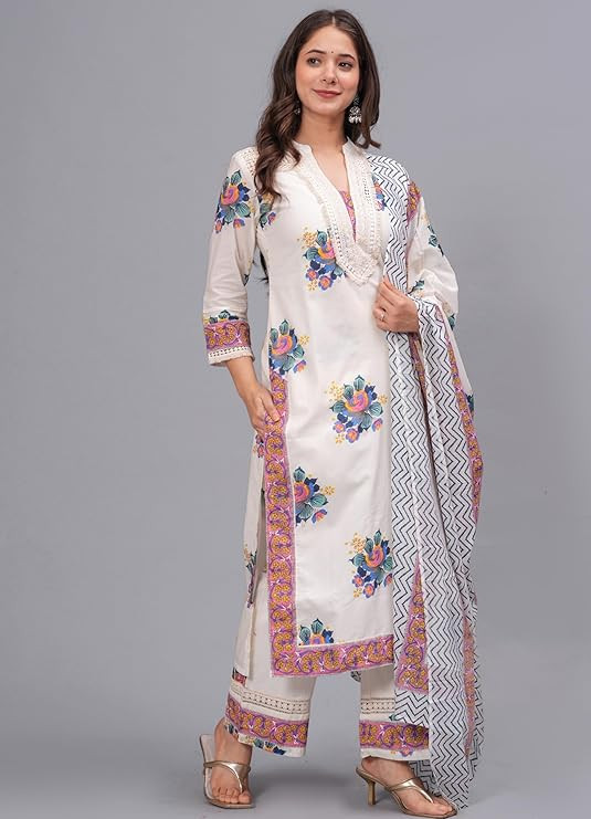 Women's Pure Cotton Printed Straight Kurta Set with Palazzo Pants & Dupatta- Ethnic Wear, White