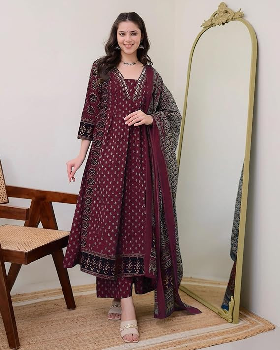 1. 🌸 Elegant Anarkali Style with Ajrakh Print: This beautifully flared Anarkali kurta features authentic Ajrakh block prints, adding traditional charm to your festive & party wardrobe. 🧵 Premium Pure Cotton Fabric: Crafted from 100% breathable cotton, this kurti set ensures all-day comfort, making it ideal for festivals, parties, and ethnic occasions. 👗 Complete 3-Piece Ethnic Set: Includes wine-colored Anarkali kurta, matching cotton palazzo, and a coordinated dupatta—perfect for effortless ethnic styling. 🎉 Perfect for Festival & Party Wear: Whether it's a festive celebration or a family function, this party wear kurta set adds grace to your look. Pairs well with jhumkas and traditional flats. 💫 Top Fashion Pick for Women: A must-have in every ethnic wardrobe—suits styles like kurta sets for woman, kurti set with dupatta, cotton suit set, and party wear dress for women stylish.