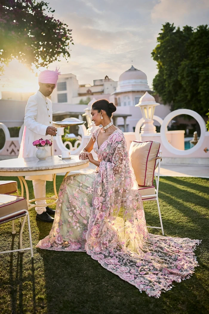 This saree features multi-coloured three-dimensional floral sequin and thread work embroidery in tones of pastels. The fully embroidered cap sleeves blouse has delicate tassels at the scalloped hem. The embroidered saree has scalloped border all over with pearl tassels.
