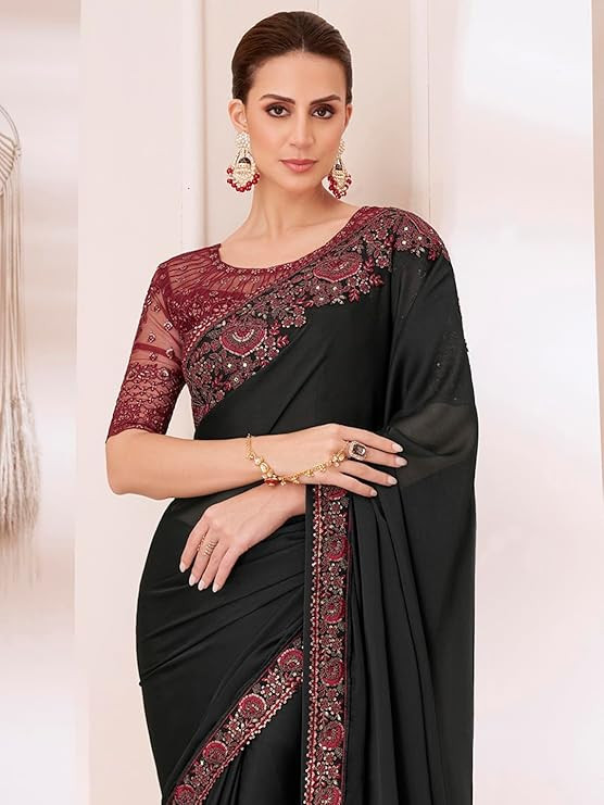 Women's Pure Chiffon Embellished Saree With Unstitched Blouse