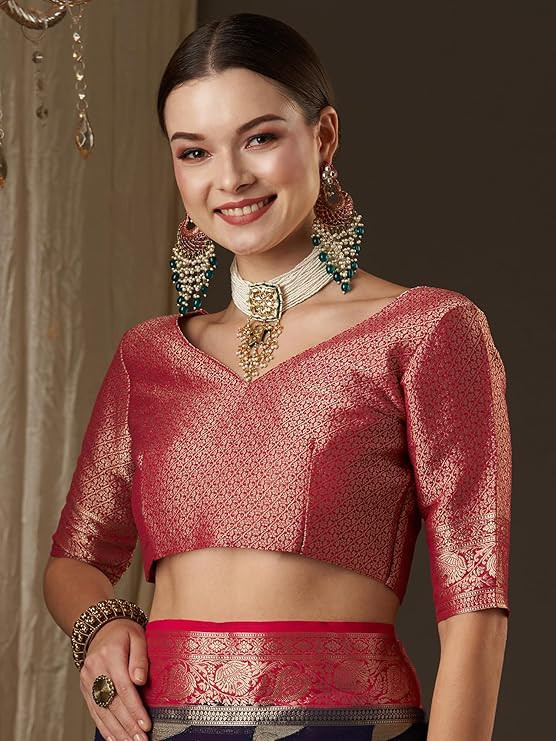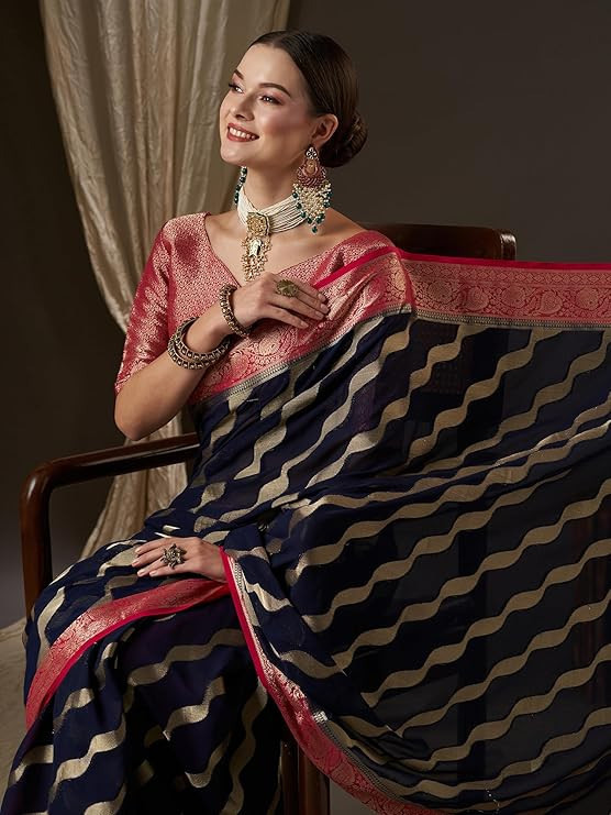 Saree Color : Navy Blue || Blouse Color : Pink Saree Fabric : Georgette || Blouse fabric : Georgette Pattern : Woven Design || Print : Abstract Saree Work Details : Tassels and Latkans || Saree Border : Zari Saree Length : 5.5 Mtr || Blouse Piece Length : 0.8 Mtr Package Contains : 1 Saree with 1 unstitched Blouse Piece