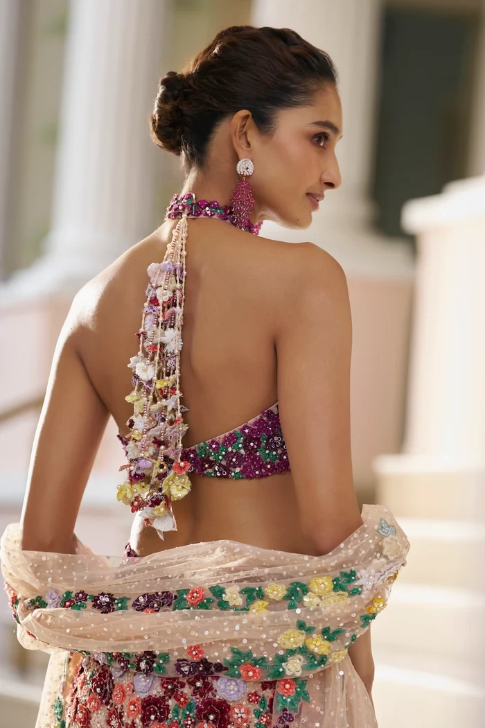 This sharara set features heavily embroidered three-dimensional embroidery in tones of ivory to yellow to peaches to pinks to plums. The 3D flowers are further accentuated with crystal, bugle beads and platinum cut sequins. The halter blouse is fully embroidered. It is paired with an embroidered dupatta with a matching border and floral motifs all over.