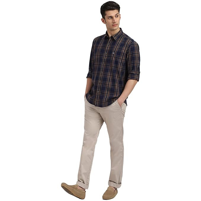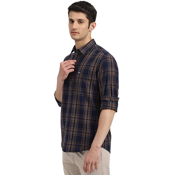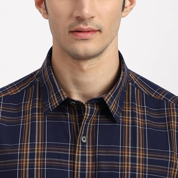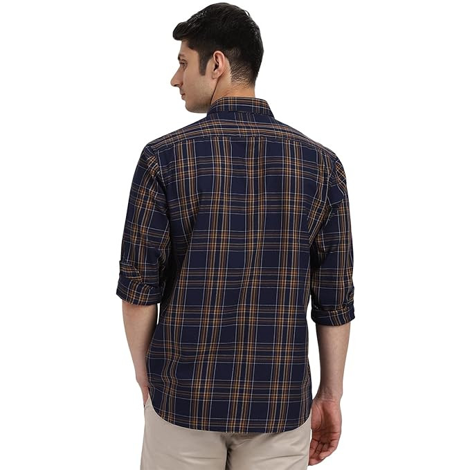 Checkered Full Sleeve Slim Fit Point Collar Cotton Casual Shirt Dark Blue