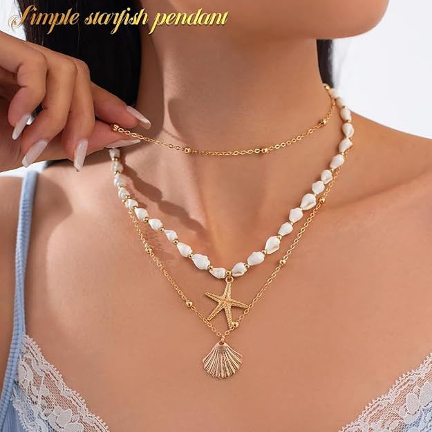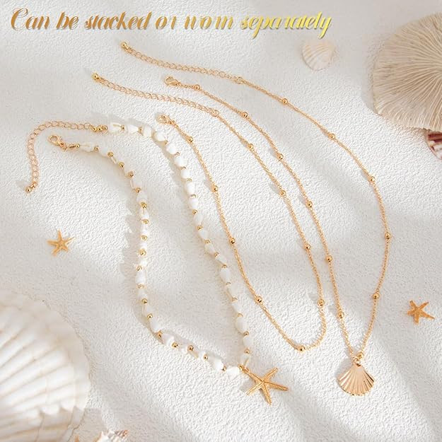 3Pcs Necklace for Women Girls Boho Gold Seashell Starfish Pendant Necklaces Layered Beads Necklace Chains Beach Jewelry Gift Item for Women