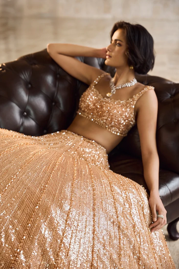This lehenga set features intricate silver and gold crystal and sequin embroidery.The blouse shows crystal tassels at the waist. Embroidered dupatta also shows crystal tassels on all four sides.