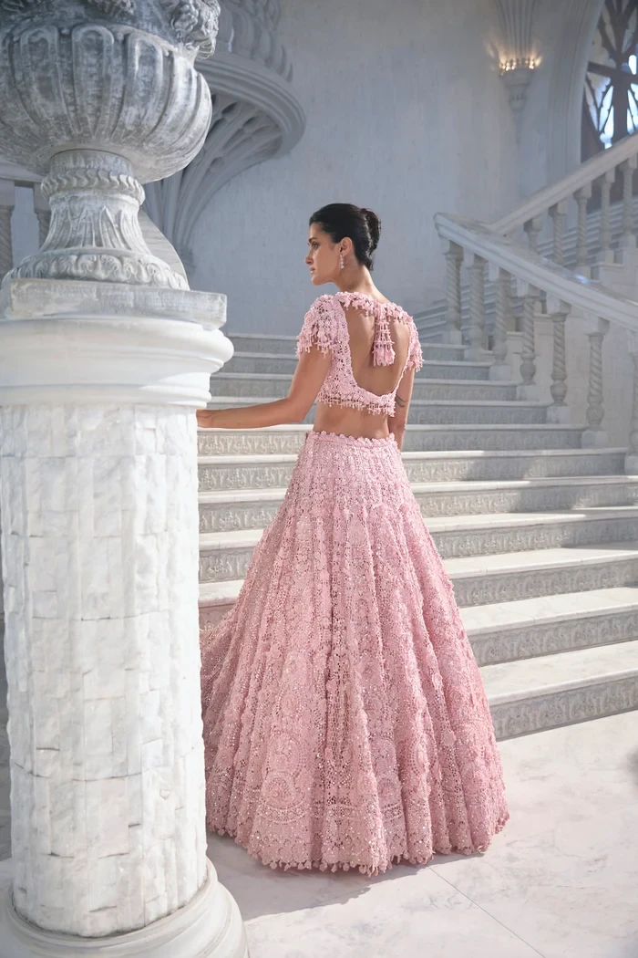 This lehenga set features heavy three-dimensional cut work embroidery in crystal, thread, pearl and sequin. The blouse shows cut work embroidery with delicate crystal tassels at the waist, sleeve and 3D flowers at the back. It is paired with the heavily embroidered dupatta shows double borders, floral motifs and floral tassels all over.