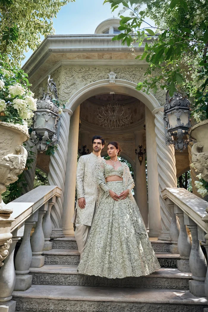 This lehenga set features all over three-dimensional embroidery further highlighted with tonal sequin and pearls. The full sleeves blouse has a plunging neckline and shows tassels at the hem. It is paired with four sided embroidered net dupatta.