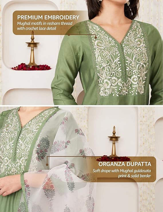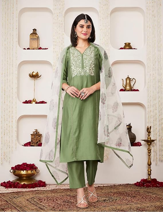Women's Embroidered Kurta Pant Set with Organza Dupatta