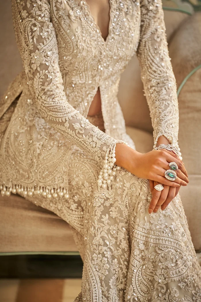 This nude sharara set features tonal thread, sequin, and pearl embroidery in a paisley pattern. The full sleeves top shows pearl tassels at the wrist as well as at the hem. It is paired with a fitted sharara and an embroidered scalloped dupatta with pearl drops on all four sides.