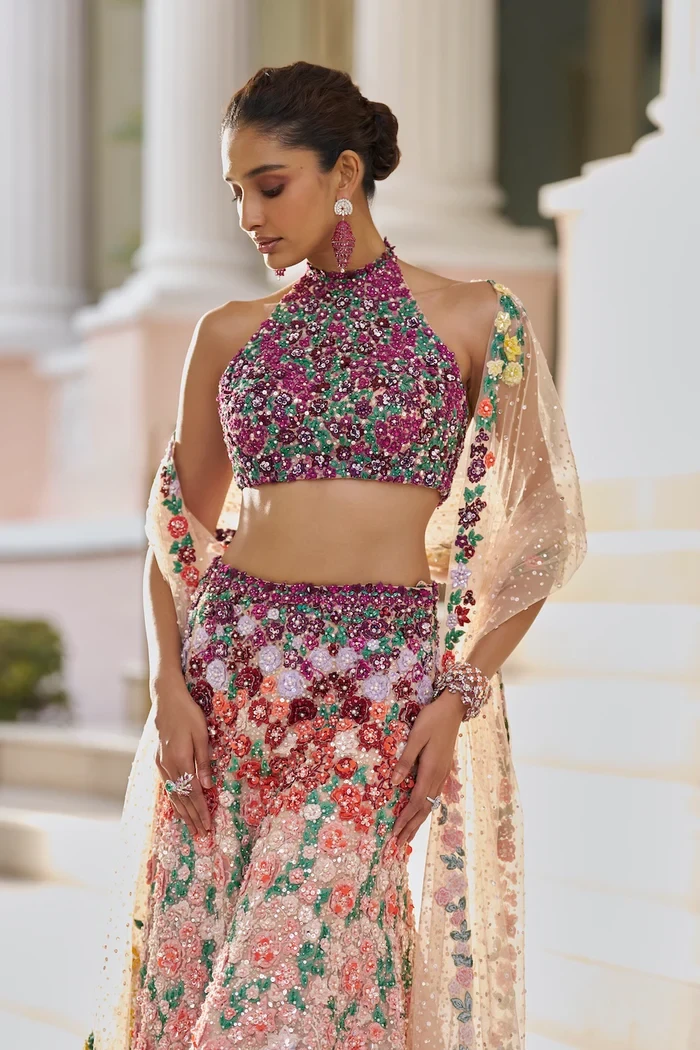 This sharara set features heavily embroidered three-dimensional embroidery in tones of ivory to yellow to peaches to pinks to plums. The 3D flowers are further accentuated with crystal, bugle beads and platinum cut sequins. The halter blouse is fully embroidered. It is paired with an embroidered dupatta with a matching border and floral motifs all over.