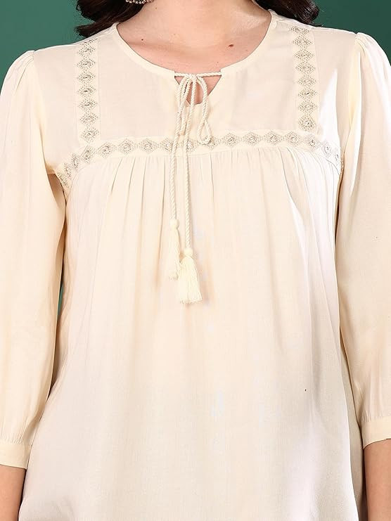 Material compositionRayon PatternSolid Fit typeRegular Fit Sleeve type3/4 Sleeve Collar styleKeyhole Collar StyleWestern Country of OriginIndia